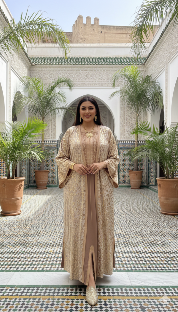 & Free Shippingكتشفي التوازن المثالي بين الفخامة التقليدية واللمسة العصرية مع هذا القفطان الفاخر المكون من قطعتين. صُمم هذا الموديل خصيصاً للمرأة التي تبحث عن إطلالة ملكية تبرز حضورها في أرقى المناسبات.